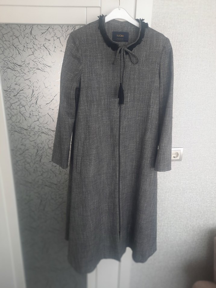 Gri keten kumaştan uzun, püsküllü detaylı kadın kaban. Notch yakalı, göğüs kısmından sonra kademeli olarak genişliyor özellikle kalça ve göbek bölgesi belli olmasını istemeyen hanımlar tercih edebilir.