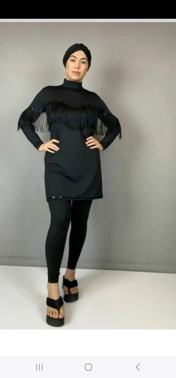 ürün 46 beden olup likralı dar kalıp olduğu için 40-44 bedene uygundur herhangi bir problemi bulunmuyor Sadece üst olarak satıştadır püsküllü kendinden yapışık sütyeni var Ben 3-4 kez kullandım uzun kollu ve yüksek yakalı bu dar kesim tunik, püskül detaylarıyla sentetik kumaştan yapılmıştır.