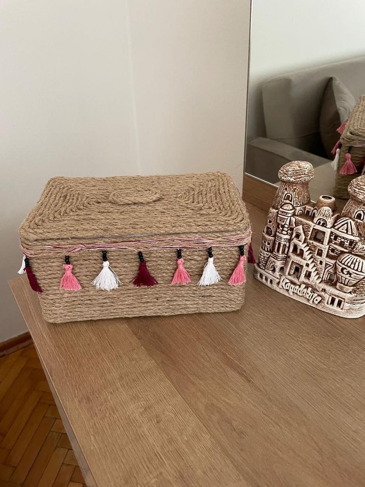 Pembe, beyaz ve bordo püsküllerle süslenmiş, kapaklı doğal hasır saklama kutusu. Hem kullanışlı hem dekoratif. Marka temsilidir