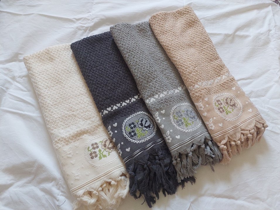 Nakışlı çiçek ve kalp desenli, uçlarında püskül detaylı, çeşitli tonlarda klasik tarz havlular. Yumuşak dokulu. adet fiyatıdır.