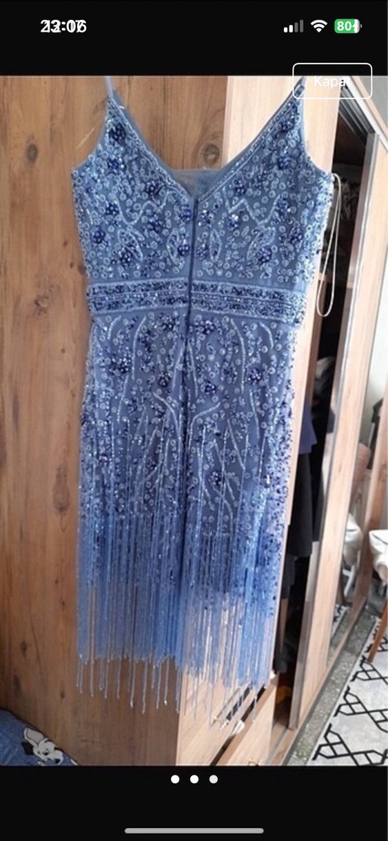 İşlemeli detaylar ve püsküllerle süslenmiş, V yaka ve askılı uzun mavi abiye elbise. Parlak dokusu ve bohem tarzı parti için uygun.