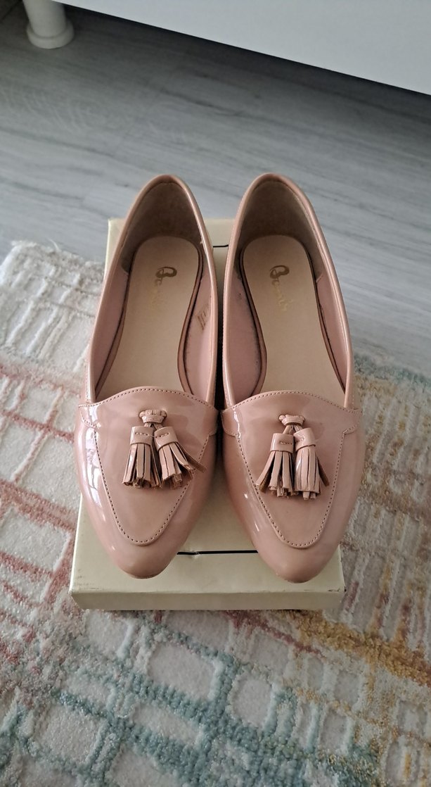 püsküllü, blok topuklu kadın babetleri, kauçuk malzemeden, ofis için klasik ve zarif bir görünüm sunar.