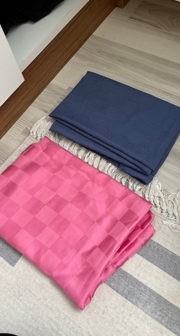 Pembe renkte, yumuşak sentetik kumaştan yapılmış, püsküllü kadın şalı.