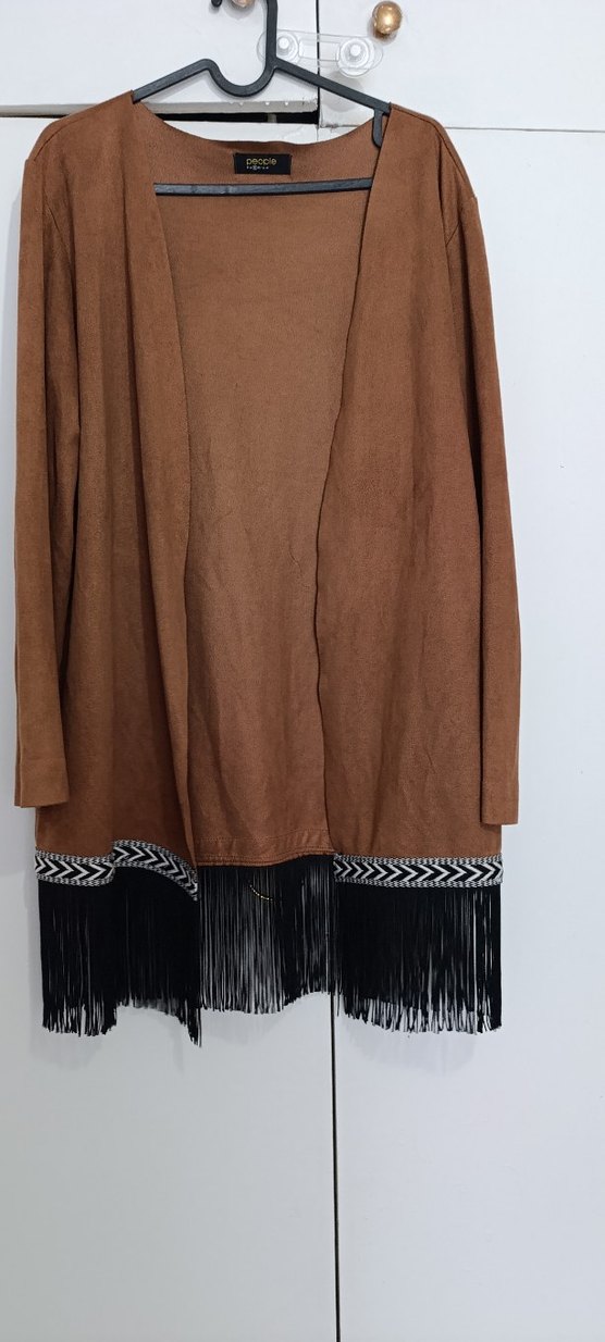 Kadınlar için uzun kollu, bol kesim ve yuvarlak yaka süet hırka. Koyu kahverengi, nakışlı ve püsküllü detaylara sahip bohem tarzda.