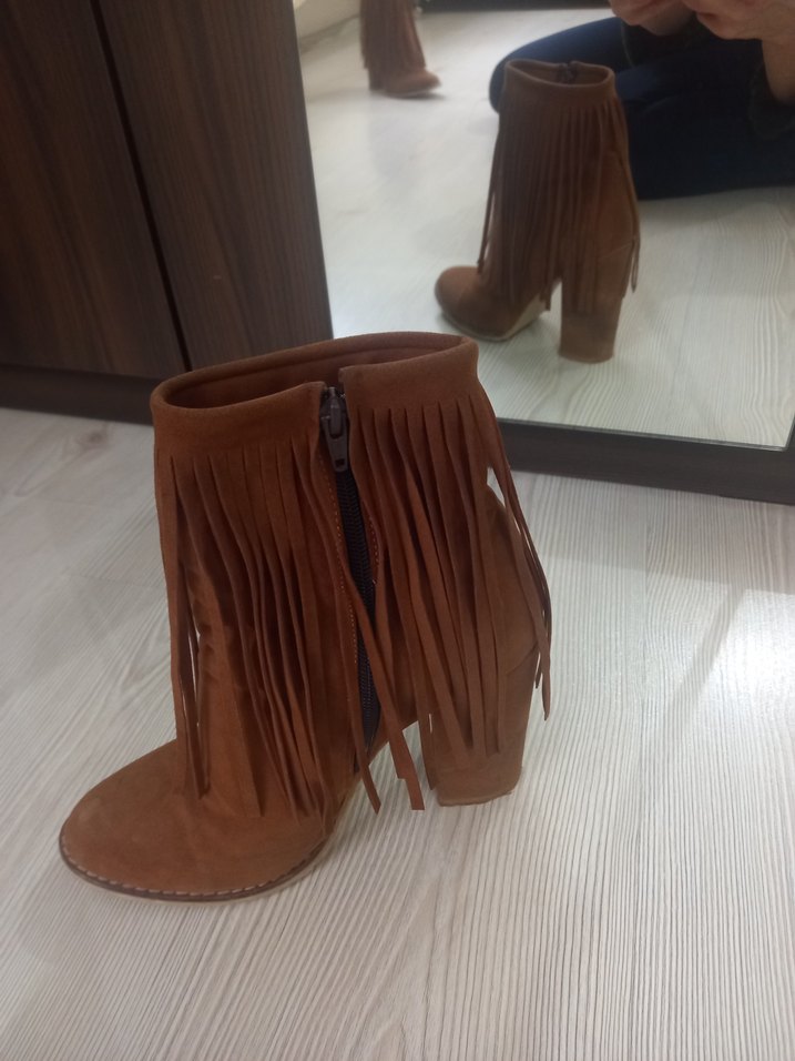 Kahverengi süet kadın botları, dolgu topuklu ve püsküllü detaylara sahip, günlük kullanıma uygun bohem tarzda.