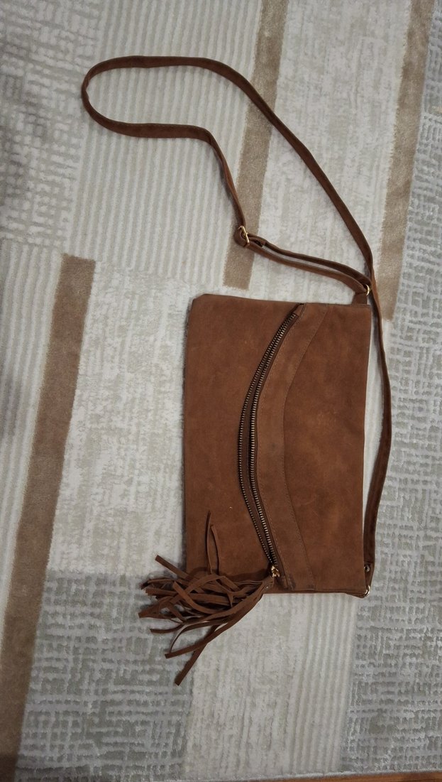 Püsküllü detaylı kahverengi süet çapraz çanta, minimalist bohem tarzda günlük kullanıma uygundur. Düz yüzey ve ayarlanabilir askıya sahiptir.