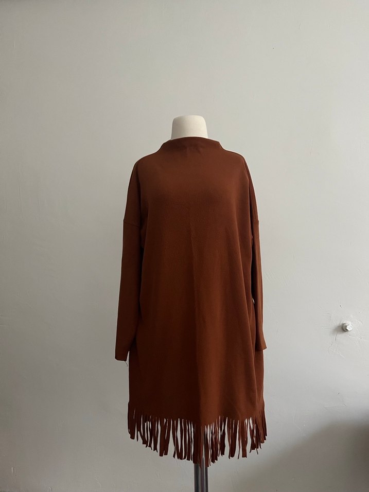 Kahverengi, uzun kollu ve yüksek yakalı triko elbise. Yumuşak süet görünümlü kumaştan, bol kesimli olup etek kısmında püskül detayları vardır. Bohem tarzını yansıtır.