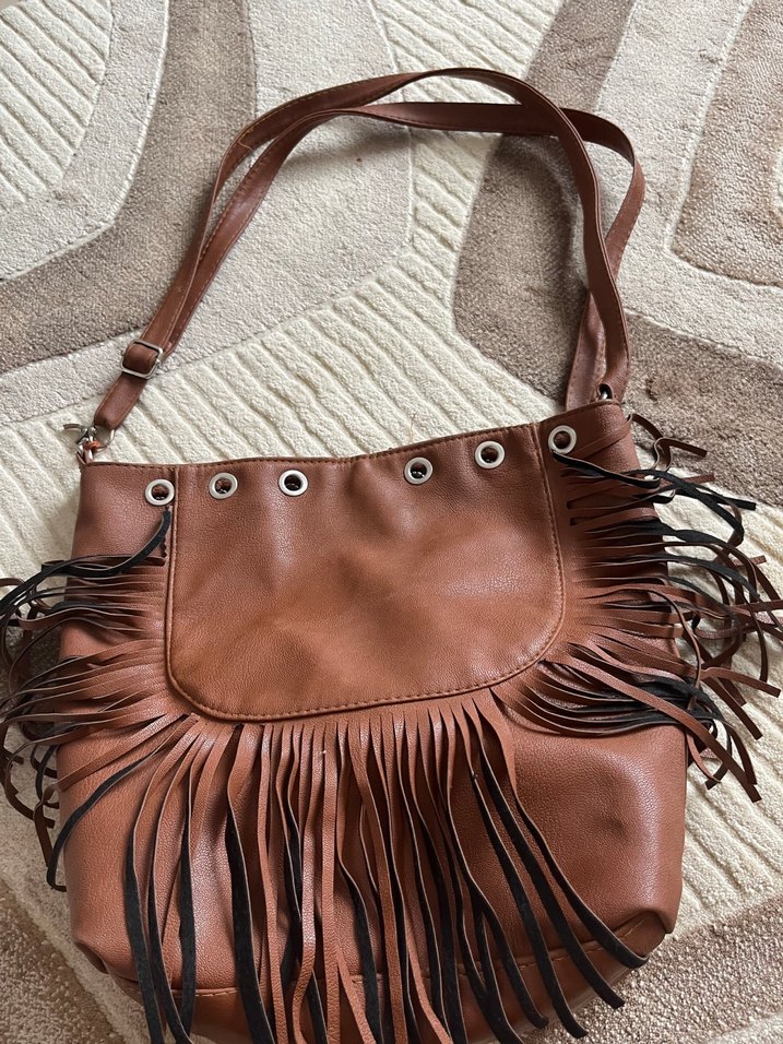 Kahverengi deri, ayarlanabilir askılı, püskül detaylı bohem stil çanta, desensiz tasarım.