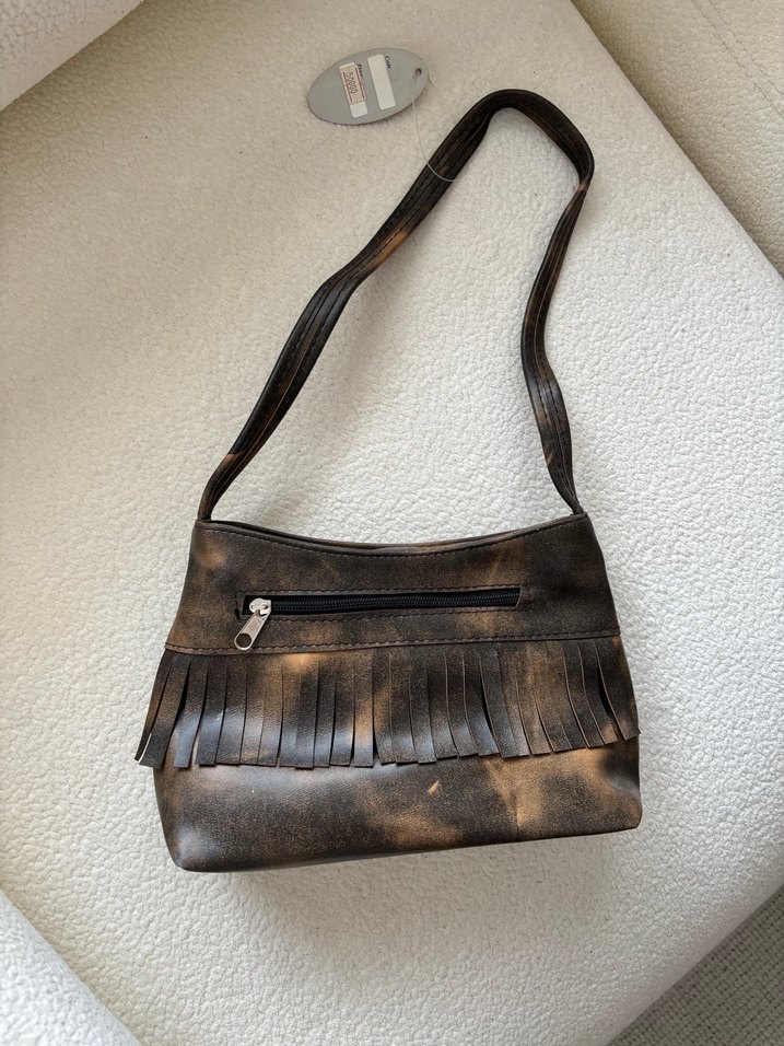 Kahverengi deri, parlak batik desenli ve püsküllü kadın çantası, günlük kullanım için bohem tarzda. Mağazamızı kapattığımız için elimizde kalanları uygun fiyata satıyorum. Tekliflere açığım.yumuşak deri çanta