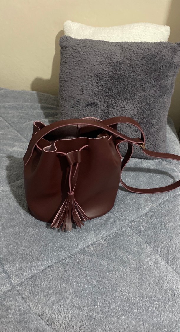 Kahverengi deri kadın çanta, püskül detaylı, minimalist ve bohem tarzda. Günlük kullanıma uygun, trend casual görünümlü.