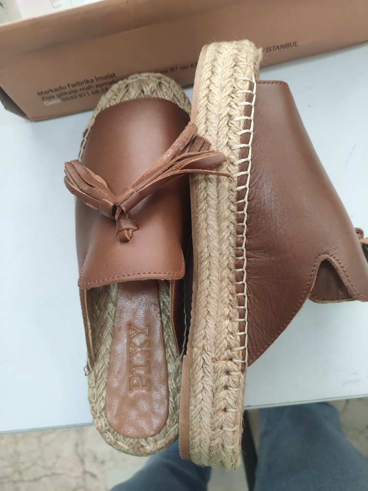 Kahverengi deri kadın terlikler, dolgu topuk ve püsküllerle bohem tarzı sunar, günlük kullanım için uygundur.