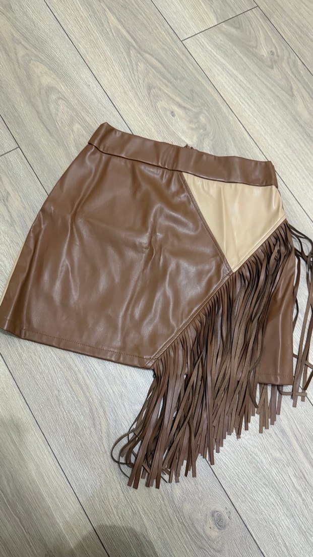 Püsküllü Kahverengi Deri Mini Etek