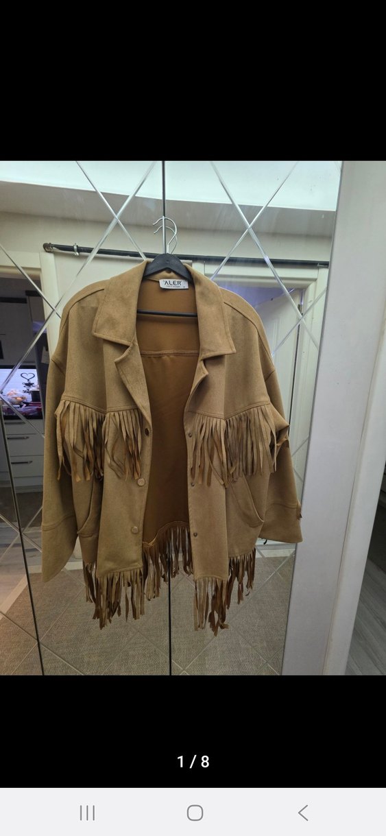 Püsküllü detaylara sahip kahverengi süet, uzun kollu, bol kesim bohem tarzı kadın ceket.