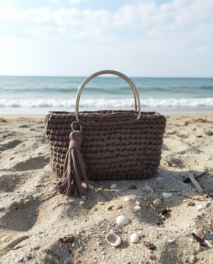 Kahverengi örgü dokulu, püsküllü ve metal saplı kadın çantası. Bohem tarzıyla plajda kullanıma uygun.