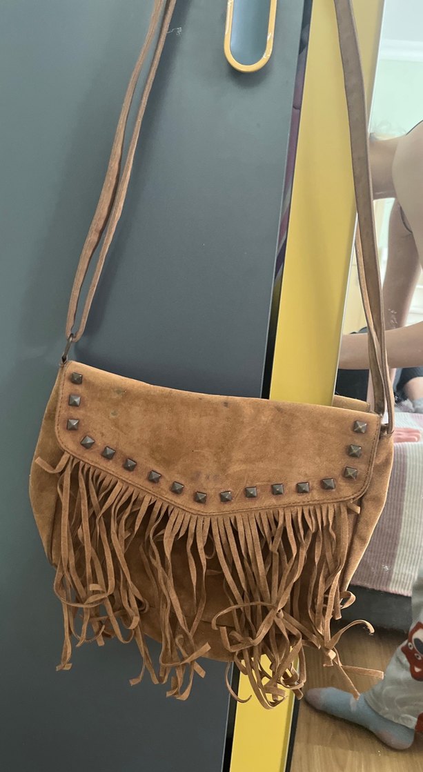 Püsküllü ve metal süslemeli kahverengi süet çanta, parlak yüzeye sahip. Bohem tarzda günlük kullanım için ideal.