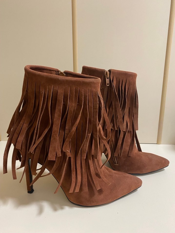 Püsküllü, ince topuklu, kahverengi süet bot. Sorunsuz ve çok şık.