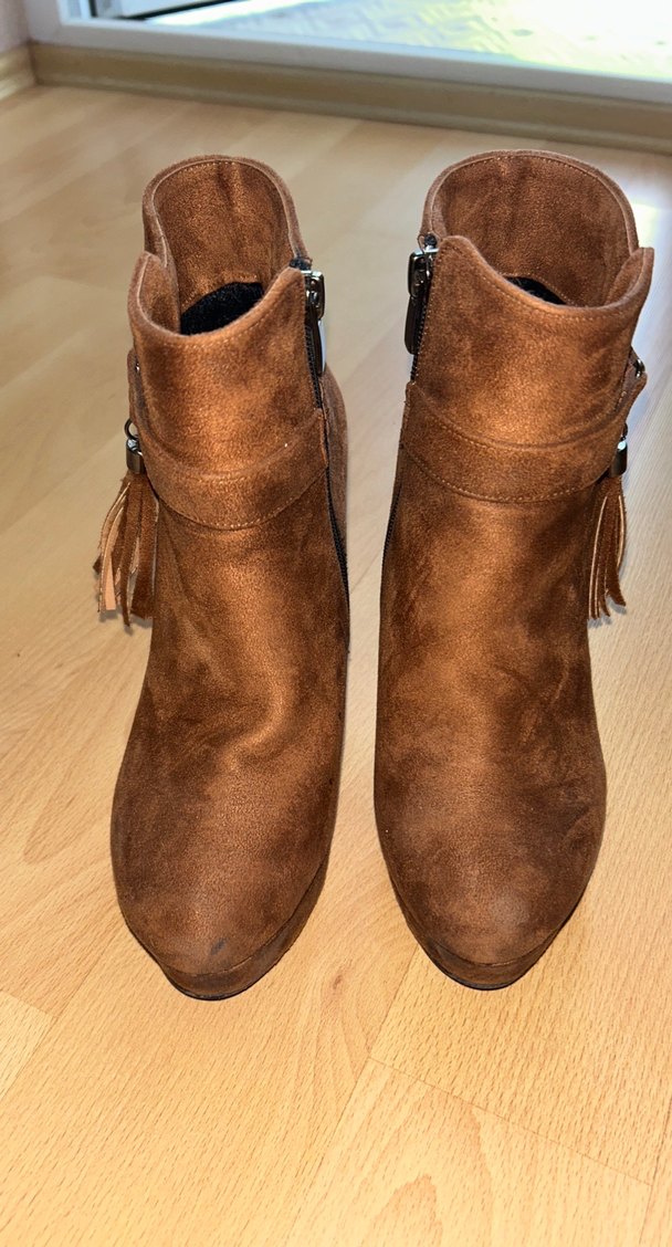 Kahverengi süet kadın botları, dolgu topuk ve püskül detaylarıyla parlak, desensiz bohem tarz sunar, günlük kullanıma uygundur. Çok kullanılmadı. Taban taraflarında birkaç çiziği var.