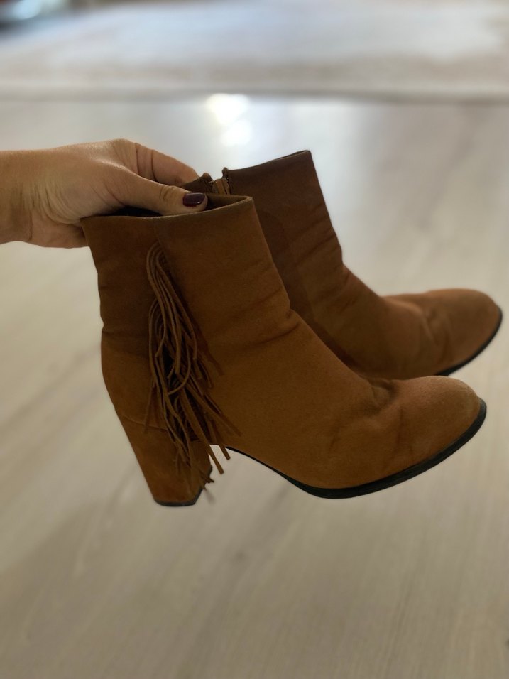 Kahverengi süet malzemeden, blok topuklu ve püskül detaylı kadın botu. Bohem tarzında, koyu tonlarda ve günlük kullanıma uygun.