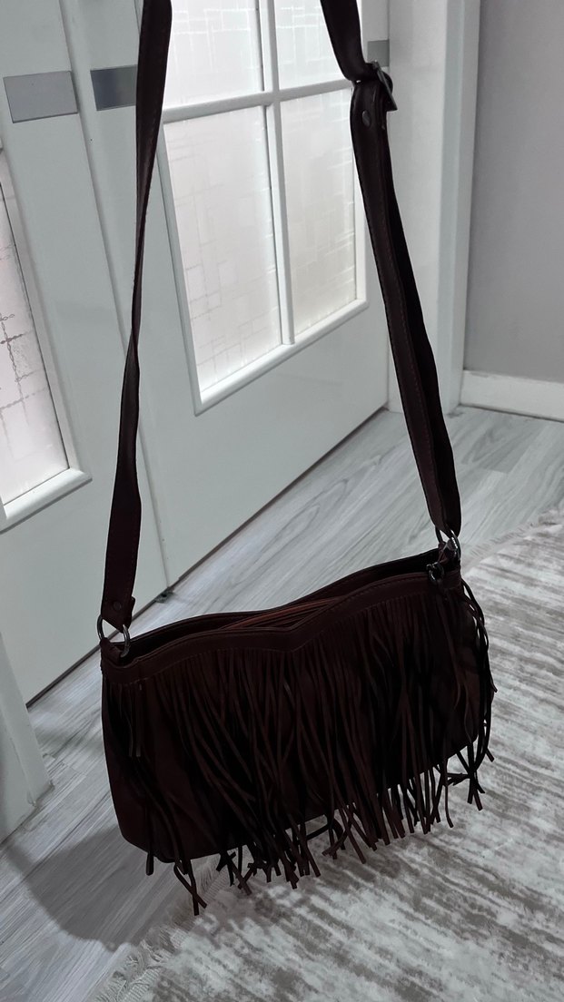 Kahverengi süet kadın çanta, püsküllü detaylara sahip, bohem tarzıyla günlük kullanıma uygun, uzun askılı ve desensizdir.