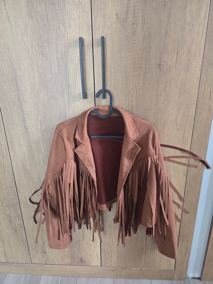 Kısa kahverengi süet ceket, uzun püsküller ve kesimli yaka ile bohem tarz sunar. normal kesim ve askılı kolludur, günlük kullanıma uygundur. yurt dışından alındı S.M uyumlu