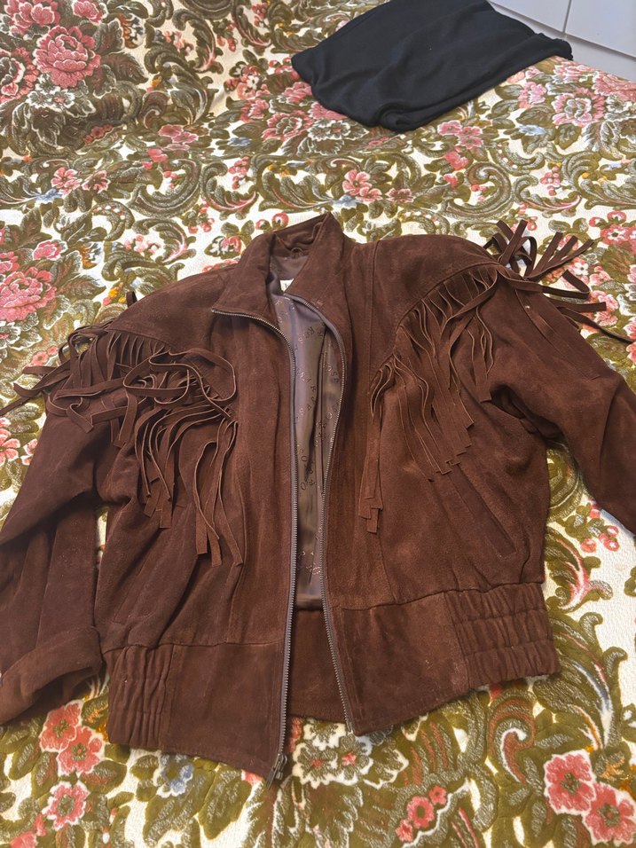 Kahverengi süet, uzun kollu, yakası kesik, nakışlı ve püsküllü detaylı bol kesim midi uzunlukta kadın deri ceket. Bohem tarz partiler için uygun.