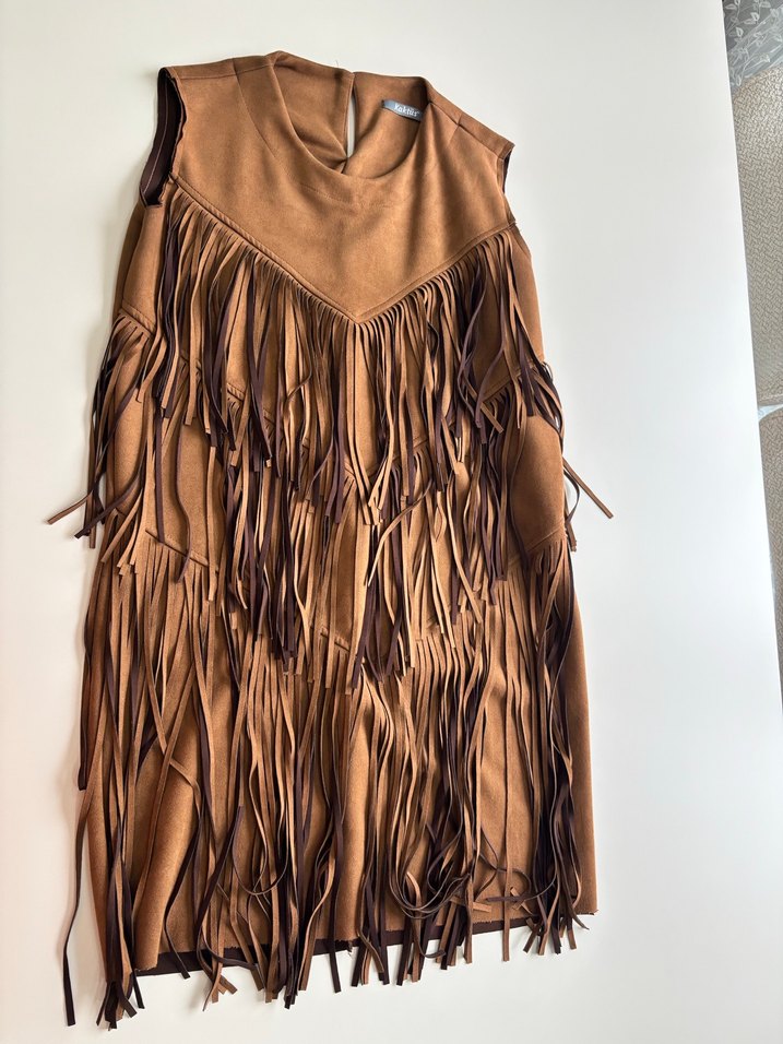 Kahverengi süet, bol kesim kadın elbise. püsküllerle süslenmiş, kolsuz tasarım. Sıfır ayarında