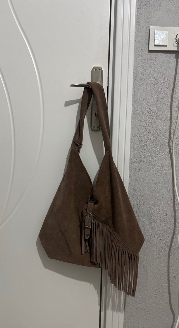 Püsküllü detaylı kahverengi süet kadın çanta, baskılı desenli ve bohem tarzda. Günlük kullanıma uygundur. Hiç kullanılmadı çok beğenerek aldım ama kombinleyemedim