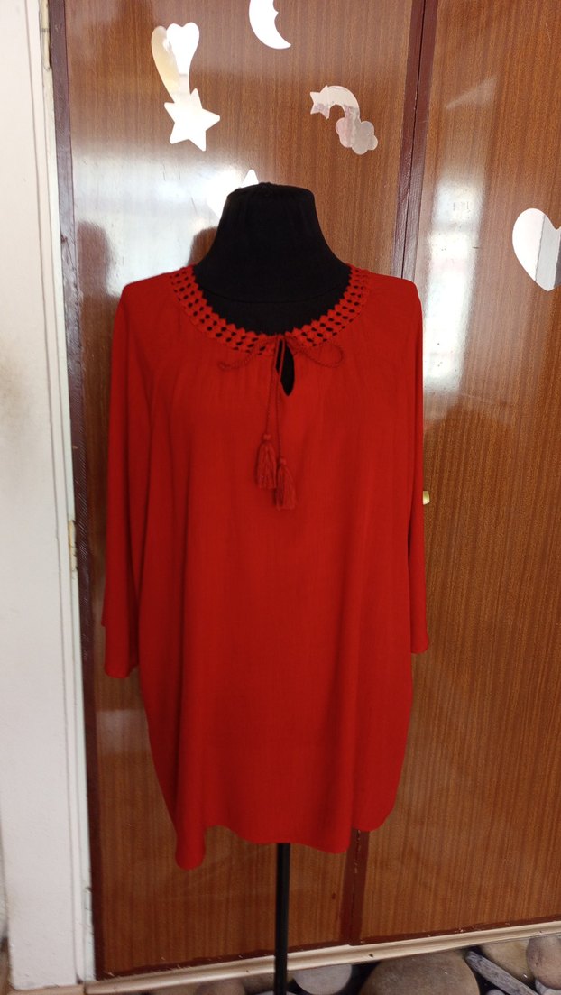 Püsküllü ve nakışlı detaylara sahip, V yakalı kırmızı, bol kesim örme kumaştan uzun kollu bohem stil bluz.
