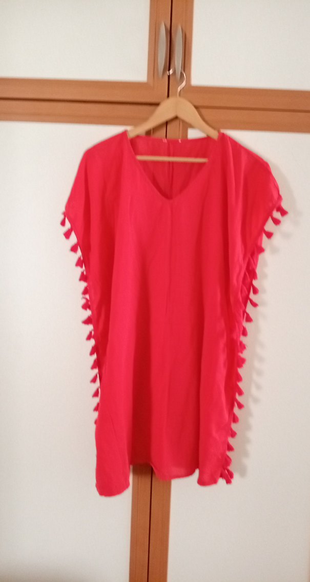 Püsküllü kenar detaylı, salaş kesim kırmızı bohem tarzda, kolsuz midi uzunlukta pareo. Plajda kullanıma uygundur.