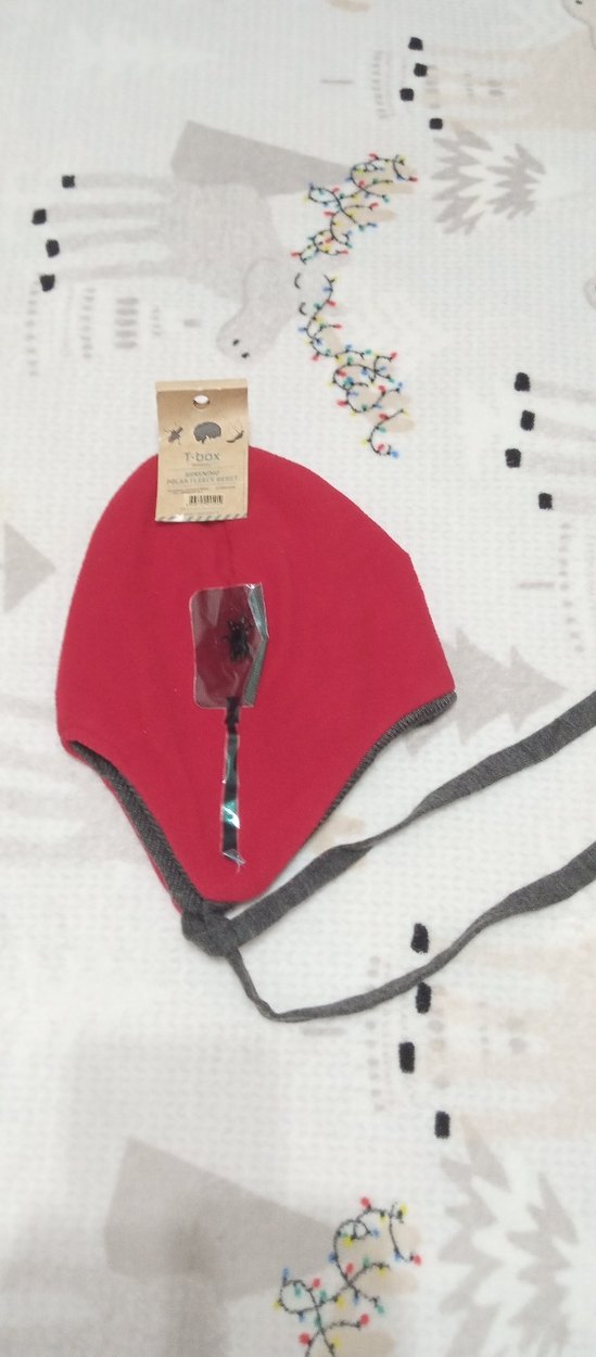 Püsküllü detaylı kırmızı çocuk bere, çene altında bağlama ipleri bulunur. Yumuşak ve sıcak kumaştan üretilmiştir, hafif baskılı desene sahiptir.
