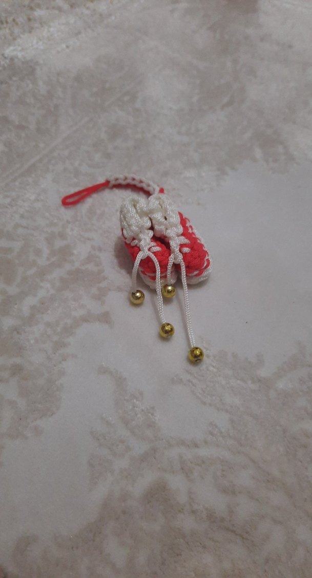 Renkli kırmızı tasarıma sahip kadın anahtarlık, beyaz püsküller ve küçük altın boncuklarla süslenmiştir, rahat ve geleneksel bir stil sunar.