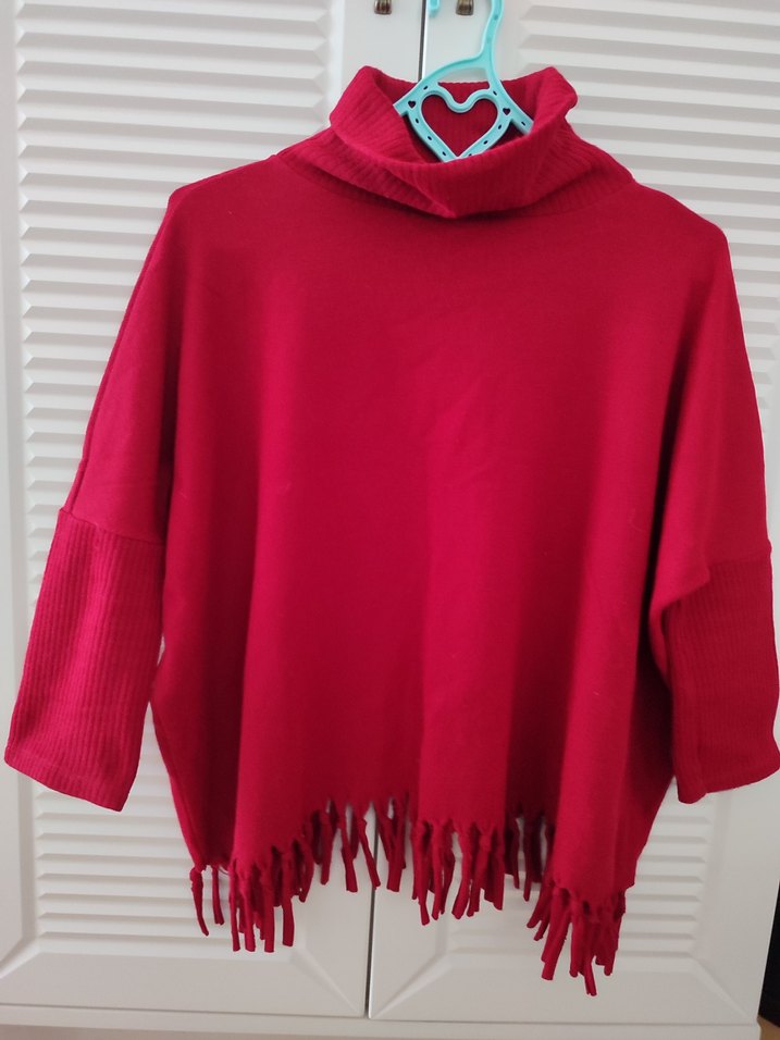 Kırmızı kadın boğazlı triko, uzun kollu ve bol kesimlidir. Midi boyda, püskül detaylı ve yumuşak, sıcak kumaştan üretilmiştir. Rahat sokak stili için uygundur. Fotoğrafta göründüğünden daha koyu bir kırmızı. herhangi bir sorunu yok