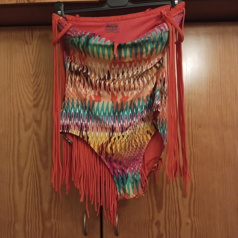 Uzun, oturan kesim kadın Mayo, bağcıklı askılı ve renkli batik desenlidir. Püskül detaylı, bohem parti tarzına uygundur. Ürün yurtdışından alınmıştır.