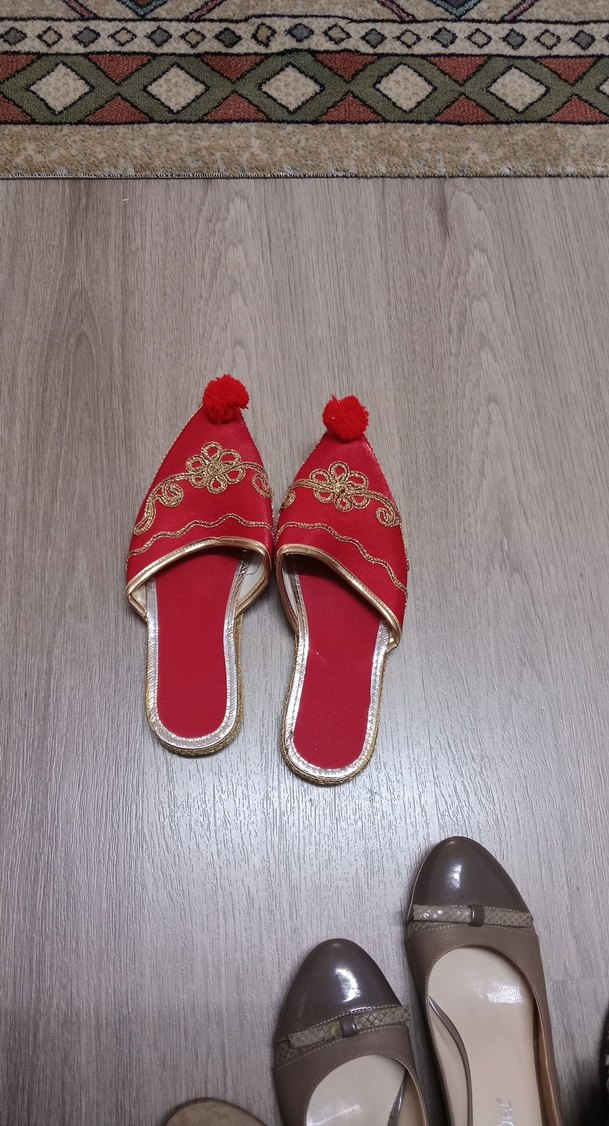 Kırmızı süet malzemeden yapılmış, dolgu topuklu kadın terlikleri. Renkli nakış ve püsküllerle süslenmiş, bohem tarzını yansıtır.