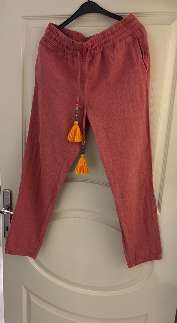 Püsküllü, keten, bol kesim bohem tarzda kadın pantolon, günlük kullanım için uygun. ✨