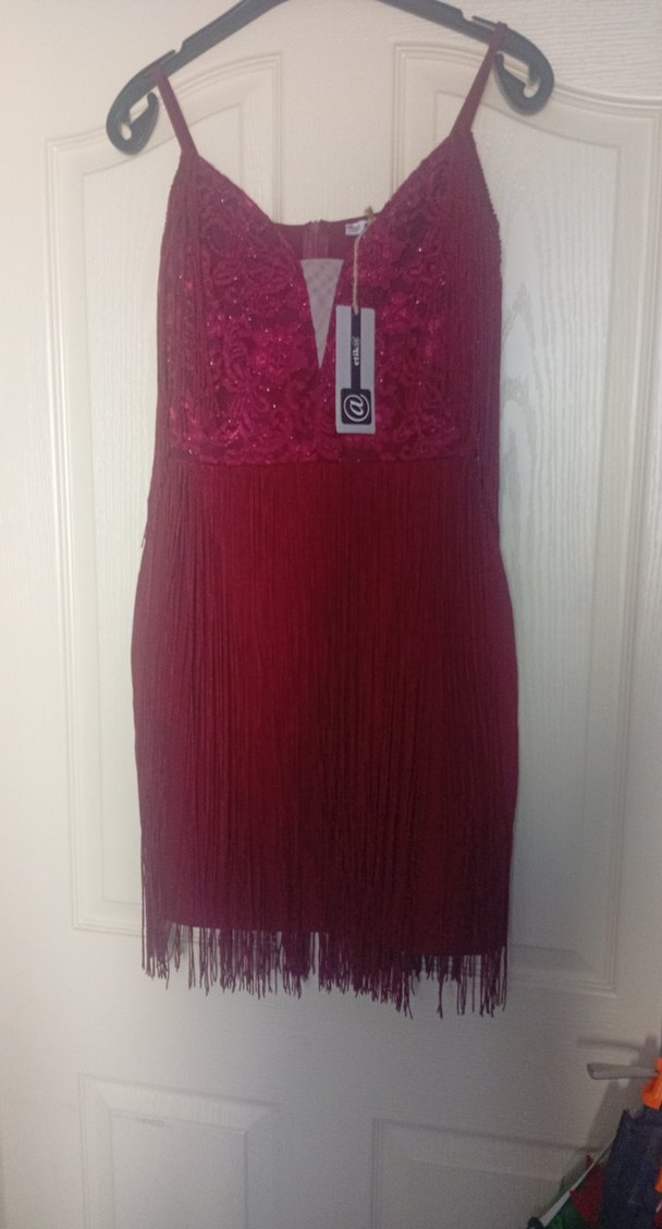 Kırmızı, v yaka ve kolsuz, püskül detaylı, bohem tarzda kısa ve vücuda oturan abiye elbise. Etiketli sıfır üründür.