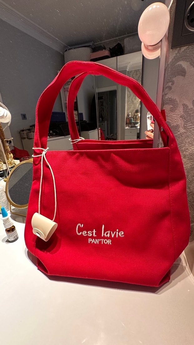 Kırmızı renkli, baskılı yazılı ve püsküllü Parisian tarzı kadın çantası, sentetik kumaştan, trend sokak stiline uygun.