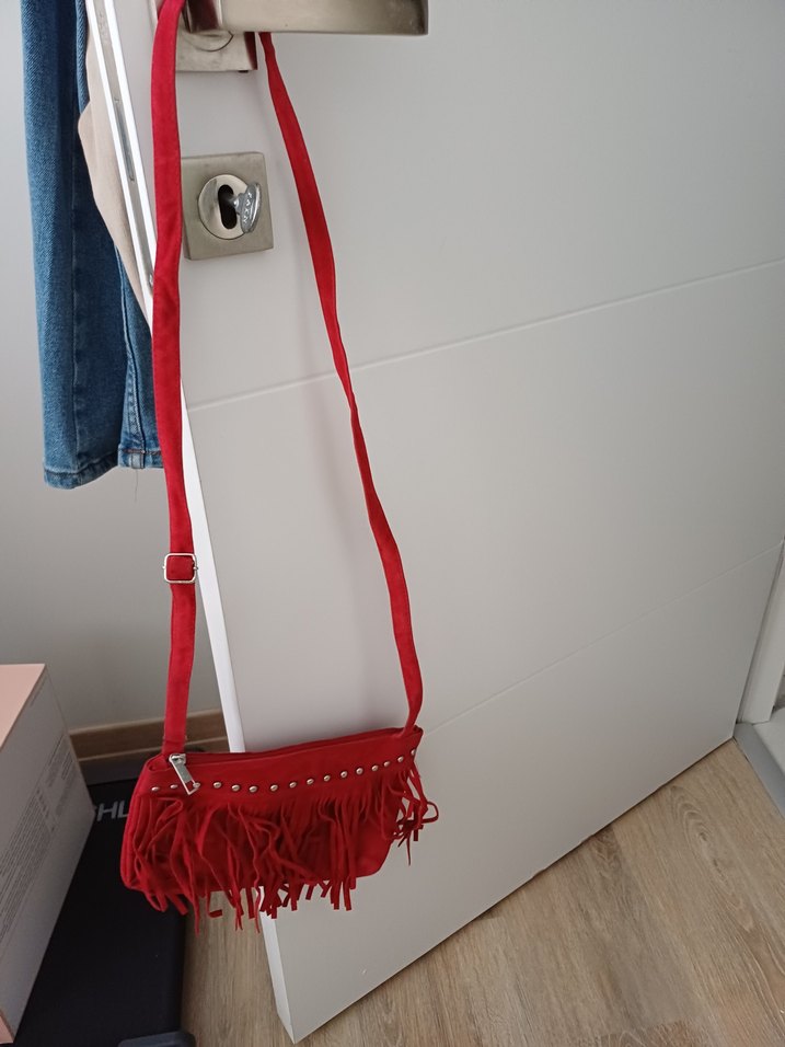 Kırmızı süet malzemeden yapılmış, püskül detaylı ve baskılı desenli bohem tarzda günlük kullanıma uygun çanta. Ayarlanabilir uzun askıya sahiptir.