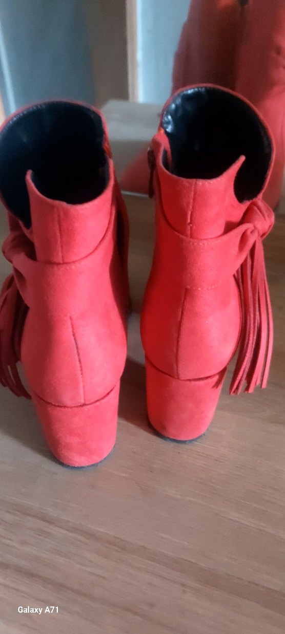 Püsküllü detaylara sahip kırmızı süet kadın botu, blok topuklu ve rahat. Romantik buluşmalar ve şık sokak stili için uygun. ❤️