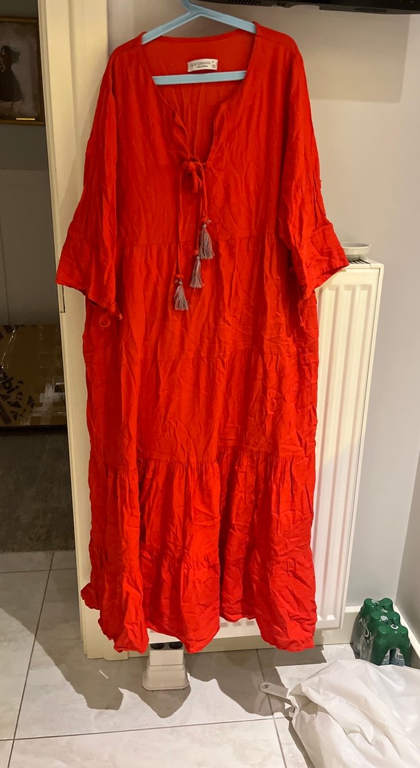 Püsküllü Kırmızı Uzun Keten Elbise