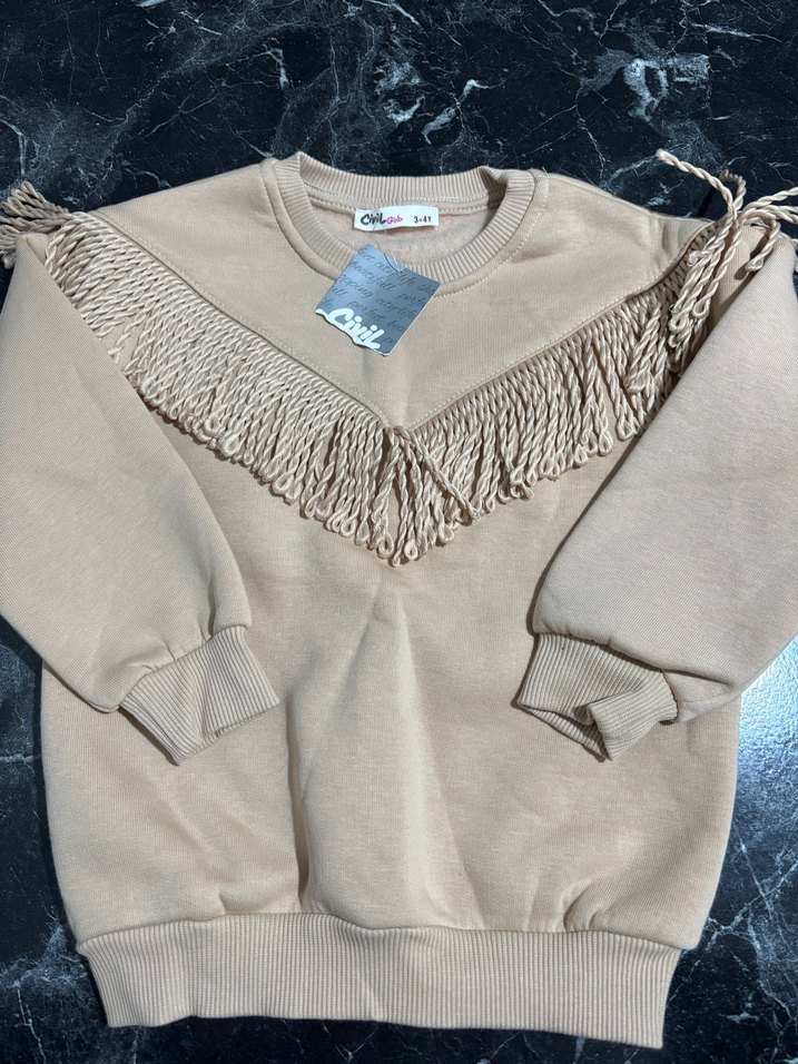 Yulafsütü renkli, yuvarlak yakalı ve uzun kollu kız sweatshirtü. Püskül detayları ve bol kesimiyle sokak stiline uygun.