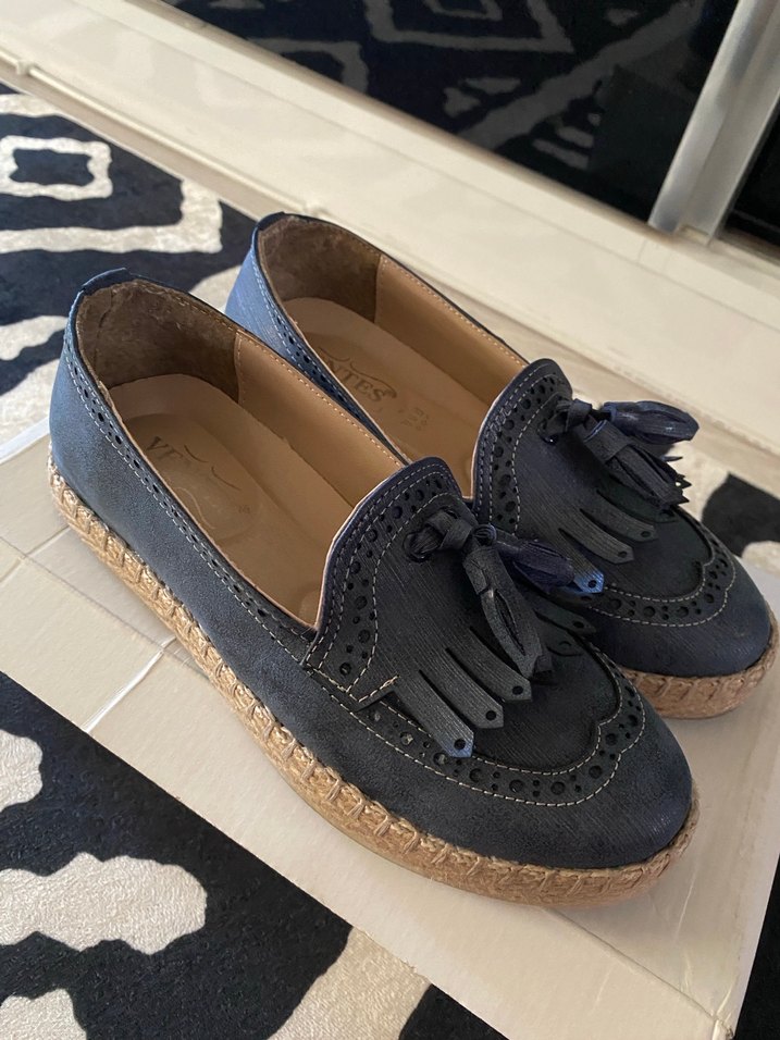 Püsküllü detaylı, bağlamalı lacivert denim dolgu topuk espadril. Günlük kullanıma uygun, bohem stilde rahat ayakkabı.
