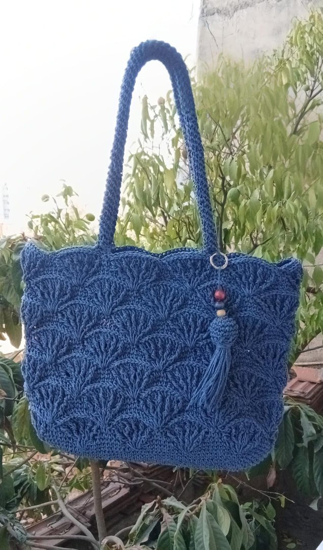 Lacivert örgü malzemeden yapılmış, püskül detaylı bohem tarzda kadın çantası. Desensiz ve renkli, günlük kullanıma uygun bir retro, hippie görünüm sunar.