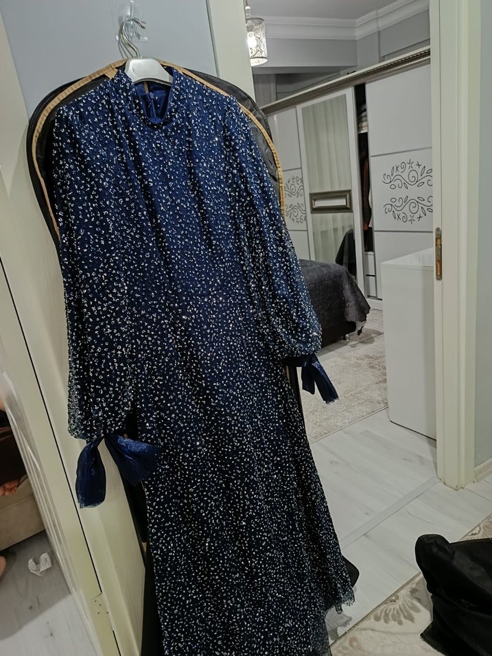 Lacivert uzun kollu elbise, notched lapel yaka ve tie-dye deseniyle. Püskül detayları ve regular fit ile Paris tarzı sunar. hazır simli eşarbı da yanında