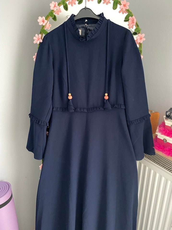 Lacivert uzun kollu elbise, yüksek yaka ve boncuklu püsküllerle detaylandırılmıştır.Defosu yoktur az kullanılmış