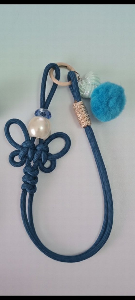 Renkli mavi bohem anahtarlık, püskül, inci görünümlü boncuk ve yumuşak ponpon içerir, minimalist ve retro tarzı yansıtır.