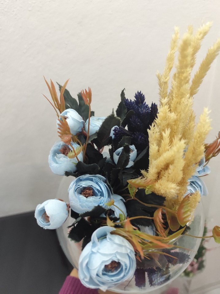 Püsküllü detaylı koyu mavi çiçekler ve doğal kurutulmuş bitkilerden oluşan bohem gelin buketi.