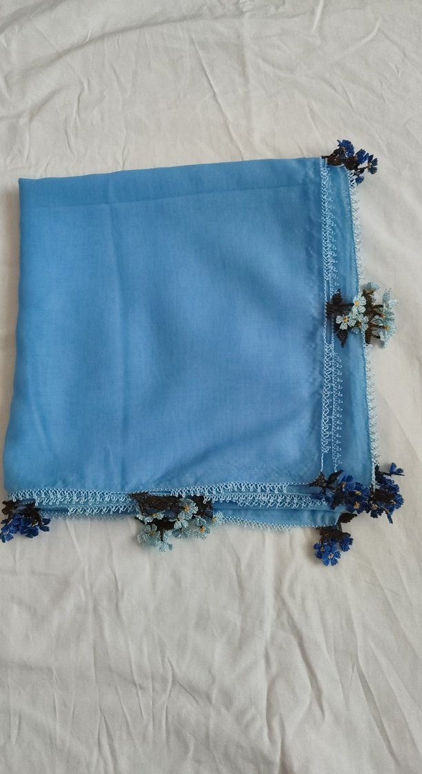 Yumuşak mavi kumaştan yapılmış, püsküllü ve çiçek detaylı bohem tarzı kadın iğne oyası yazma