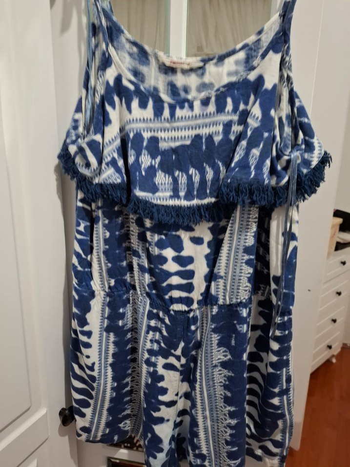 Mavi ve gri tie-dye desenli, bol kesim, askısız kadın tulumu. Püsküllü detaylara sahip, kolsuz ve günlük kullanım için uygundur.