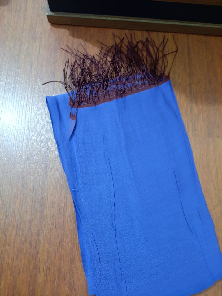Püsküllü detaylara sahip parlak mavi sentetik kumaştan yapılmış kadın şalı, sade bohem tarzını yansıtıyor.